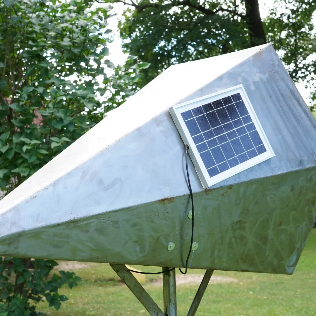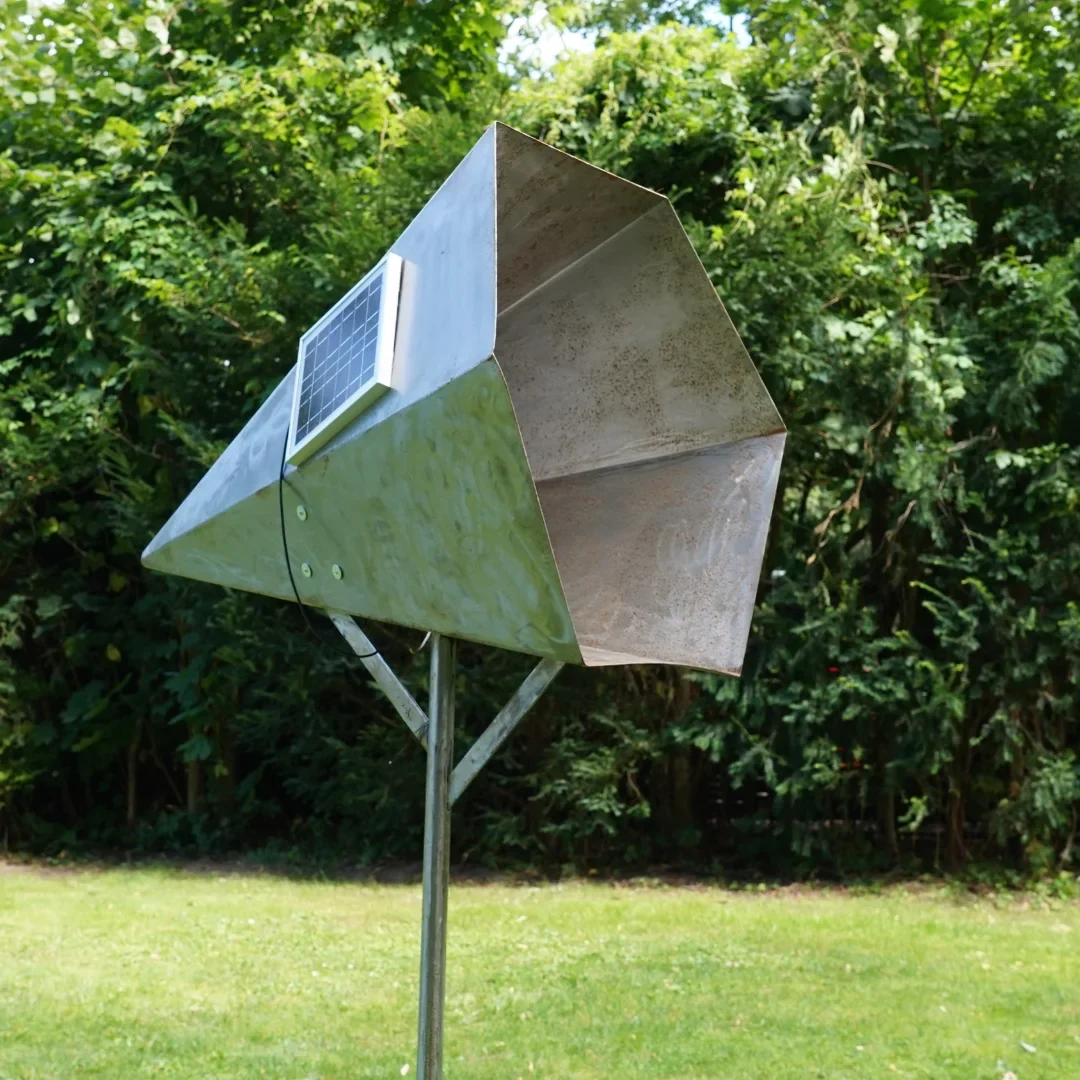 metal, solar panels, arduino, electronic compass sensor, amplifiers, speakers, shakers